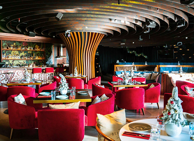 From reception to restrooms, we ensured every detail reflects bespoke craftsmanship. The entrance welcomes guests with custom wood paneling and stone inlay flooring, followed by an open-plan dining area enhanced by layered lighting and ceiling treatments. Custom banquettes and dining tables were fabricated in-house. A curved bar with backlit shelving and mirrored accents creates a glamorous focal point. The restrooms feature our HPL cubicle systems with integrated plumbing panels for durability and style. Wall cladding, integrated AV systems, and acoustic panels enhanced both performance and ambiance.