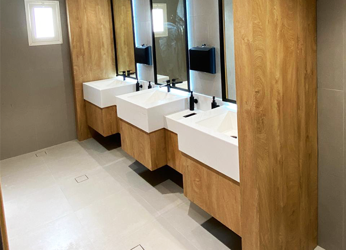 Each area was meticulously redesigned to meet functional, ergonomic, and aesthetic goals. Fire-rated flush doors were installed for enhanced safety, and clean-lined cabinetry solutions provided efficiency in operations. Public restrooms were equipped with full HPL toilet cubicle systems and anti-bacterial urinal partitions.